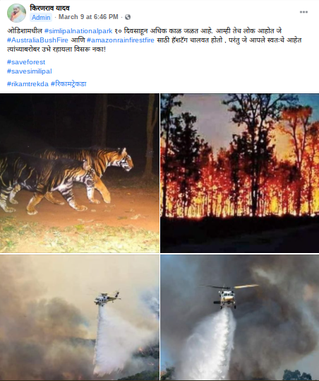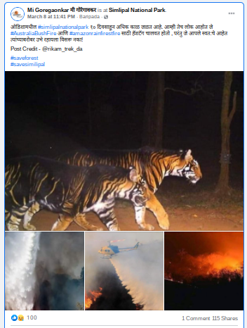 आमच्या पडताळणीत हे स्पष्ट झाले की, ओडिशातील सिमलीपाल मध्ये भीषण आग लागून मोठी हानी झाली आहे मात्र व्हायरल फोटो हे या आगी दरम्यानचे नाहीत सोशल मीडियात ते चुकीच्या दाव्याने व्हायरल झाले आहेत.