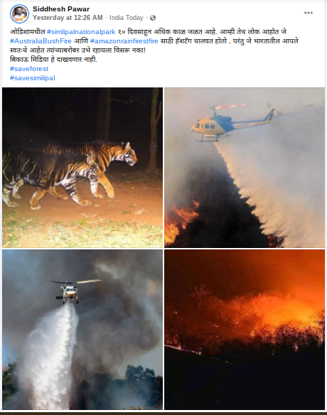 आगीवर पाणी टाकणाऱ्या हेलिकॉप्टरचे फोटो ओडिशातील सिमलीपालच्या आगीचे नाहीत तर अमेरिकेतील आहेत. 2017 साली लॉस एंजल्स शहर प्रशासनाने वणव्याला रोखण्यासाठी लॉकहिड मार्टिन सायकॉर्स्की कंपनीचे दोन हेलिकॉप्टर खरेदी केले होते. हे त्या हेलिकॉप्टरचे फोटो आहेत.