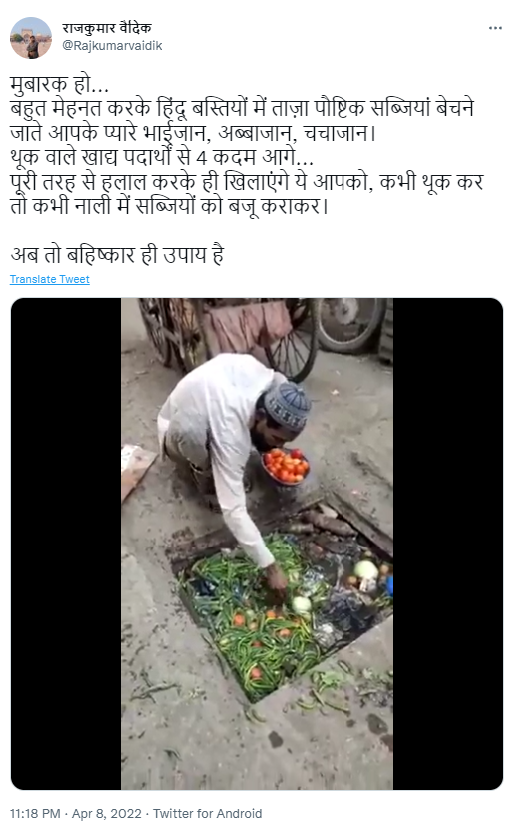हा व्हायरल व्हिडिओ ट्विटरवर शेअर करत एका युजरने लिहिलंय की, ही व्यक्ती गटारीच्या पाण्याने भाज्या धुवून हिंदू लोकांना विकायला जाणार आहे.