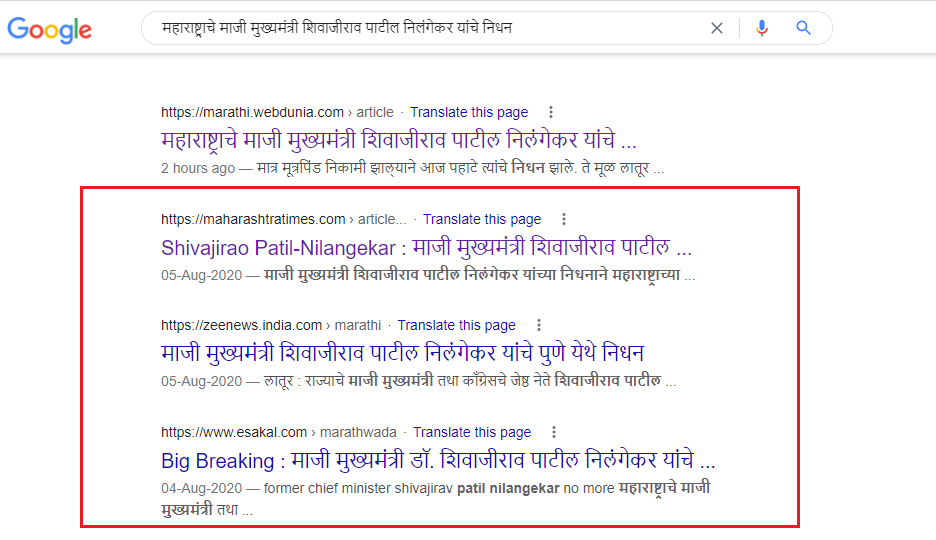 महाराष्ट्राचे माजी मुख्यमंत्री शिवाजीराव पाटील निलंगेकर यांचे खरंच आज पुण्यात निधन झाले, याची तथ्य पडताळणी करण्यासाठी आम्ही गुगलवर ‘महाराष्ट्राचे माजी मुख्यमंत्री शिवाजीराव पाटील निलंगेकर यांचे निधन’ असं टाकून शोधले.