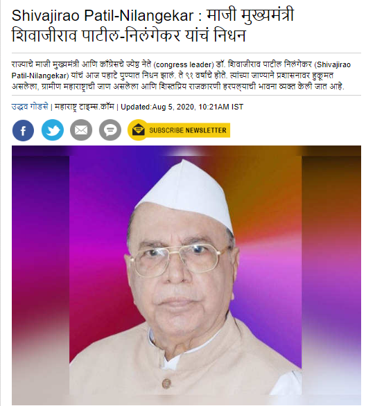 त्यावेळी आम्हांला २०२० मधील काही बातम्या मिळाल्या. महाराष्ट्र टाइम्स यांच्या बातमीनुसार, ५ ऑगस्ट २०२० रोजी किडनी विकाराने महाराष्ट्राचे माजी मुख्यमंत्री शिवाजीराव पाटील निलंगेकर यांचे ९१ व्या वर्षी निधन झाले. २०२० मध्ये त्यांना कोरोनाची लागण झाली होती, पण त्यावर त्यांनी मात केली होती. त्याच दिवशी त्यांची प्रकृती अचानक बिघडली. त्यानंतर त्यांना पुण्यातील रुबी क्लिनिकमध्ये उपचारासाठी नेण्यात आले. पहाटे २ वाजून १५ मिनिटांनी त्यांची प्राणज्योत मालवली. शिवाजीराव पाटील निलंगेकर हे महाराष्ट्राचे दहावे मुख्यमंत्री होते. तसेच ते १९८५-८६ मध्ये देखील ते मुख्यमंत्री होते. १९९०-९१ मध्ये त्यांनी काँग्रेसचे प्रदेशाध्यक्ष पद त्यांनी भूषवले होते.