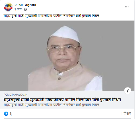 फेसबुकवर पीसीएमसी तहलका यांनी देखील बातमी दिली की, महाराष्ट्राचे माजी मुख्यमंत्री शिवाजीराव पाटील निलंगेकर यांचे आज पुण्यात निधन झाले.
