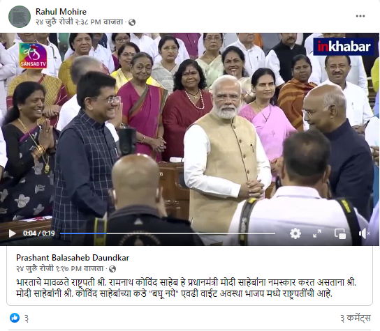 फेसबुकवर अक्षय बेरड या युजरने प्रशांत बाळासाहेब दौंडकर यांचा व्हिडिओ शेअर करत लिहिले,”भारताचे मावळते राष्ट्रपती श्री. रामनाथ कोविंद साहेब हे प्रधानमंत्री मोदी साहेबांना नमस्कार करत असताना श्री. मोदी साहेबांनी श्री. कोविंद साहेबांच्या कडे “बघू नये” एवढी वाईट अवस्था भाजप मध्ये राष्ट्रपतींची आहे.”