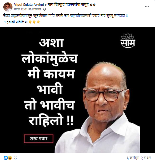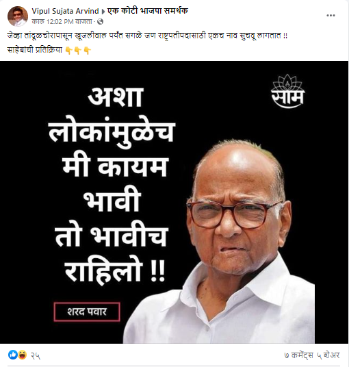 “जेव्हा तांदूळचोरापासून खूजलीवाल पर्यंत सगळे जण राष्ट्रपतीपदासाठी एकच नाव सुचवू लागतात !! साहेबांची प्रतिक्रिया” असं विपुल सुजाता अरविंद यांनी पोस्टमध्ये लिहिले आहे. ही पोस्ट फेसबुकवर अनेक युजरने शेअर केली आहे.