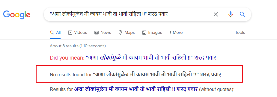 शरद पवार यांनी राष्ट्रपती पदासंबंधितचे हे विधान खरंच केले आहे का, याची तथ्य पडताळणी करण्यासाठी आम्ही “अशा लोकांमुळेच मी कायम भावी ते भावीच राहिलो” हे विधान गुगलवर टाकून शोधले. तेव्हा आम्हांला कोणतीही माहिती मिळाली नाही. यावरून एक गोष्ट स्पष्ट झाली की, हे विधान शरद पवार यांनी केलेले नाही.