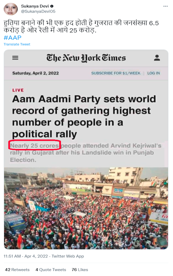 सोशल मीडियावरील युजर्सचे म्हणणे आहे की, ६.५ कोटी लोकसंख्या असलेल्या गुजरातमध्ये २५ कोटी लोकं रॅलीत कसे काय सामील होऊ शकतात ? स्क्रिनशॉटला खरा आहे, असं मानून लोकं द न्यूयॉर्क टाइम्सवर चुकीची बातमी छापल्याचा आरोप करत आहे.