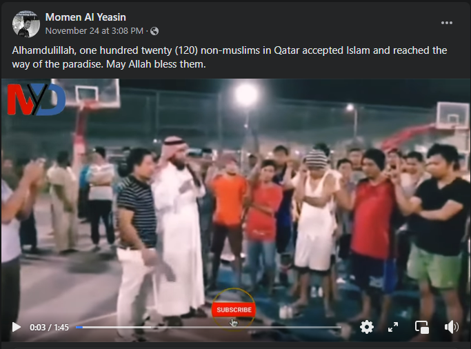 त्यानंतर आम्ही व्हिडिओच्या मुख्य फ्रेम्सचा रिव्हर्स इमेज शोध घेतला, ज्यामुळे आम्हाला 14 मार्च 2018 रोजीच्या या Youtube व्हिडिओकडे नेले “60 फिलिपिनो इस्लाममध्ये बदलले” असे शीर्षक होते. पुढील शोधामुळे आम्हाला 11 मार्च 2018 रोजी अरबी शीर्षकासह आणखी एका Youtube व्हिडिओकडे नेले, ज्यामध्ये असे म्हटले आहे की, कतारमधील दोहा येथील अल-शहानिया येथील चॅलेंजर कंपनीमध्ये हे धर्मांतरण झाले.