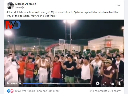2022 FIFA विश्वचषक गेल्या रविवारी कतारमध्ये सुरू झाला, वादग्रस्त मुस्लिम धर्मगुरू आणि भारतातून फरार झाकीर नाईक यांच्या नेतृत्वात या कार्यक्रमादरम्यान मोठ्या प्रमाणात धर्मांतर झाल्याचा आरोप करणाऱ्या दाव्यांच्या भाऊगर्दीत सुरुवात झाली. आता, आणखी एक व्हिडिओ व्हायरल होत आहे, “कतारमधील गैर-मुस्लिमांनी इस्लाम स्वीकारला आहे” असा दावा करून हा व्हिडीओ पसरत असून हे सामूहिक धर्मांतरण एका धर्मोपदेशकाने केल्याचा दावा होत आहे.