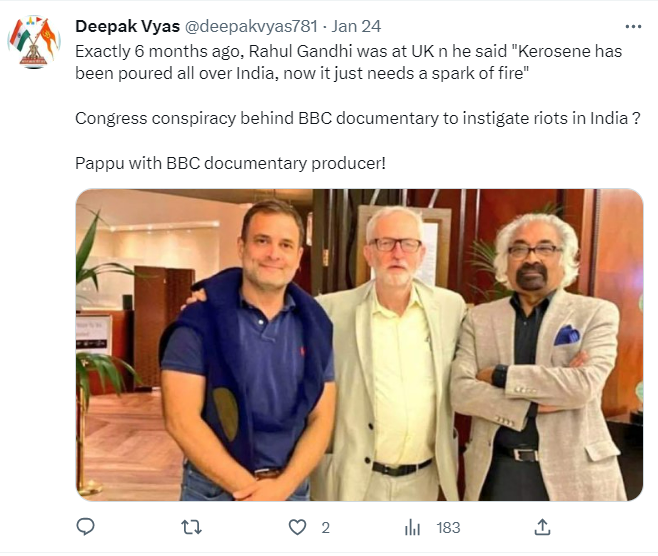 जेरेमी कॉर्बिनसोबतचा राहुल गांधींचा २०२२ चा फोटो व्हायरल करून दावा केला जात आहे की ते पंतप्रधान नरेंद्र मोदींवरील वादग्रस्त बीबीसी माहितीपटाच्या निर्मात्याला भेटले होते.