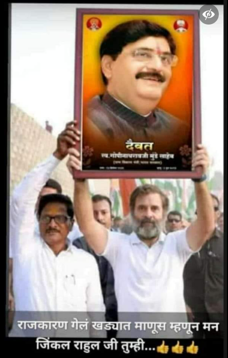 देशभरात सध्या गाजत असलेली काँग्रेसची भारत जोडो यात्रा सध्या महाराष्ट्रात आली आणि सोशल मीडियावर विविध पोस्ट चा पाऊस पडू लागला. या यात्रेत काँग्रेस नेते राहुल गांधी दिवंगत भाजप नेते गोपीनाथ मुंडे यांचा फोटो घेऊन चालल्याची पोस्टही अशीच व्हायरल झाली. गोपीनाथ मुंडे हे एक ज्येष्ठ नेते होते त्यामुळे भाजप चे असले तरी राहुल गांधी यांनी त्यांची प्रतिमा आपल्या हाती घेतली. राहुल गांधी राजकारणाच्या पलीकडील नाते जपत आहेत. राजकारण गेलं खड्ड्यात राहुल गांधी यांचे कौतुक करावे तितके कमी अश्या पोस्ट फेसबुक आणि इंस्टाग्राम वर पाहायला मिळाल्या. व्हाट्सअप सारख्या माध्यमांवरही ही पोस्ट पसरू लागली होती.