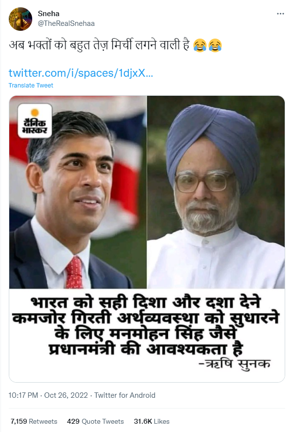 ब्रिटनचे नवे पंतप्रधान ऋषी सुनक यांनी भारताचे माजी पंतप्रधान मनमोहन सिंग यांचे कौतुक केल्याचा दावा सोशल मीडियावर केला जात आहे.हा दावा दैनिक भास्करच्या एका कथित पोस्टद्वारे करण्यात आला आहे,त्यानुसार ऋषी सुनक म्हणाले की,भारताला योग्य दिशा देण्यासाठी आणि घसरत चाललेली अर्थव्यवस्था सुधारण्यासाठी मनमोहन सिंग यांच्यासारख्या पंतप्रधानांची गरज आहे.ही पोस्ट फेसबुक आणि ट्विटरवर मोठ्या प्रमाणात शेअर केली जात आहे.