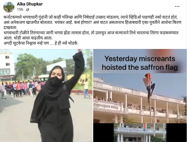 कर्नाटकात तिरंगा काढून भगवा फडकवण्यात आला असल्याच्या दाव्याने एक व्हिडिओ व्हायरल होत आहे. यात म्हटले आहे. कर्नाटक हे ‘हिजाब विरुद्ध भगवी-शाल’ आंदोलनाचे रणांगण बनले आहे.