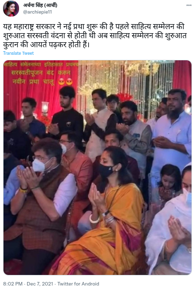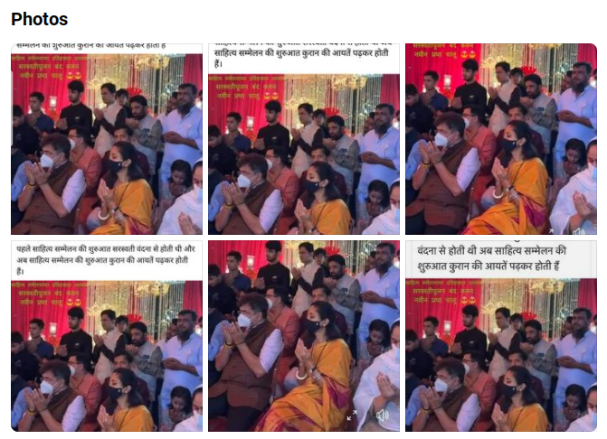 साहित्य संमेलनाची सुरुवात राष्ट्रवादी काॅंग्रेसच्या खासदार सुप्रिया सुळे आणि मंत्री जितेंद्र आव्हाड यांच्या उपस्थितीत कुराणातील आयत वाचून करण्यात आली असल्याचा दावा सोशल मीडियात व्हायरल झाला आहे. यात सुप्रिया सुळे आणि जितेंद्र आव्हाड तसेच तेथील लोक दुवा मागत असल्याचे फोटोत दिसत आहे.