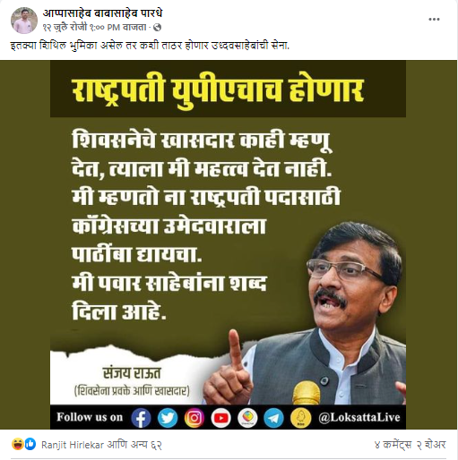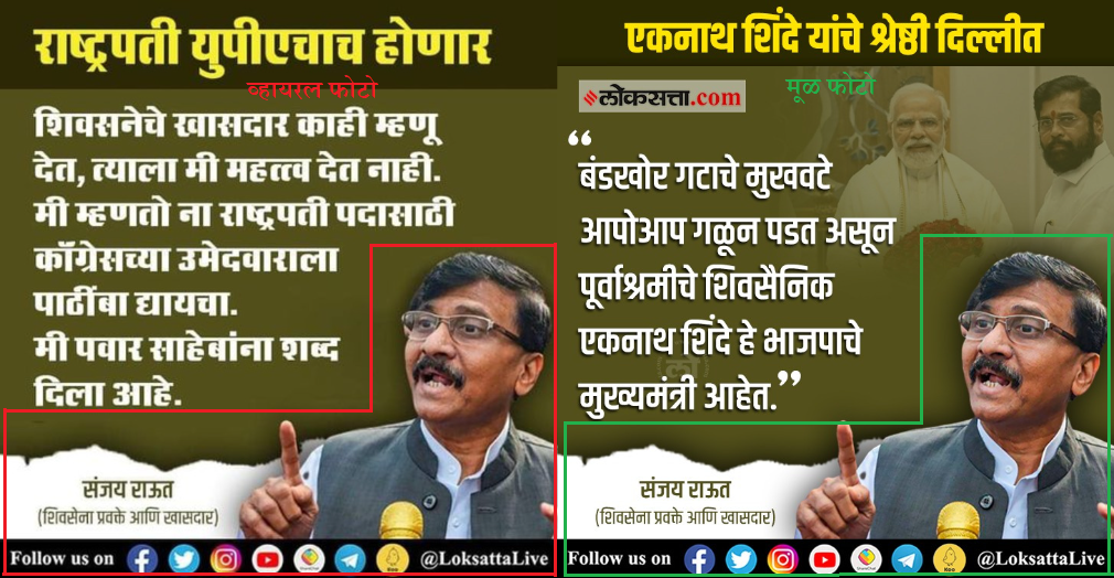 सोशल मीडियावर लोकसत्ताचा एक फोटो व्हायरल होत आहे. त्या फोटोद्वारे दावा केलाय की,”राष्ट्रपती युपीएचाच होणार. शिवसेनेचे खासदार काही म्हणू देत, त्याला मी महत्त्व देत नाही. मी म्हणतो ना राष्ट्रपती पदासाठी काँग्रेसच्या उमेदवाराला पाठींबा द्यायचा. मी पवार साहेबांना शब्द दिला आहे.” असे विधान शिवसेनेचे खासदार व प्रवक्ते संजय राऊत यांनी केले आहे.