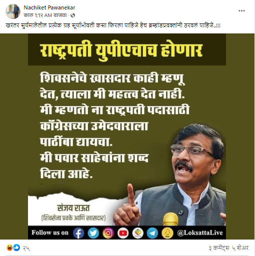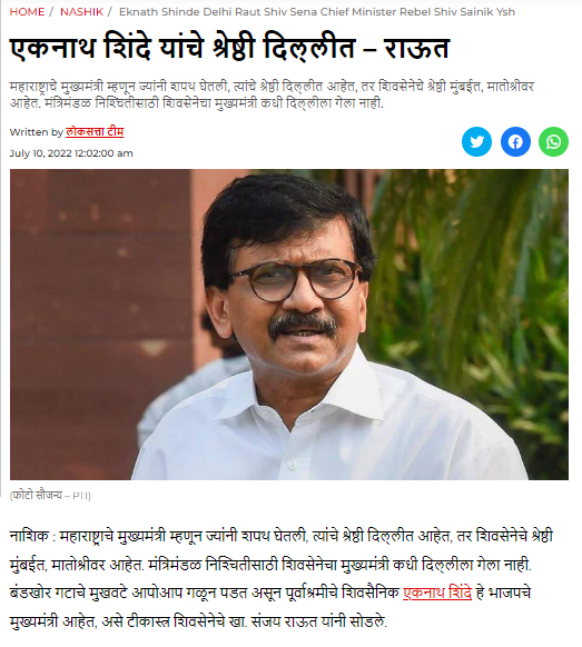 या विधानासंदर्भात अधिक माहिती जाणून घेण्यासाठी आम्ही “राष्ट्रपती युपीएचाच होणार. शिवसेनेचे खासदार काही म्हणू देत, त्याला मी महत्त्व देत नाही. मी म्हणतो ना राष्ट्रपती पदासाठी काँग्रेसच्या उमेदवाराला पाठींबा द्यायचा. मी पवार साहेबांना शब्द दिला आहे.” यातील काही शब्द गुगलवर टाकून शोधले. तेव्हा आम्हांला १० जुलै २०२२ रोजीची लोकसत्ताची बातमी मिळाली. त्या बातमीनुसार, बंडखोर गटाचे मुखवटे आपोआप गळून पडत असून पूर्वाश्रमीचे शिवसैनिक एकनाथ शिंदे हे भाजपचे मुख्यमंत्री आहेत, असे टीकास्त्र शिवसेनेचे खासदार संजय राऊत यांनी सोडले. आम्हांला बातमीतील आणि मूळ फोटोचा मजकूर एकच असल्याचे आढळले.