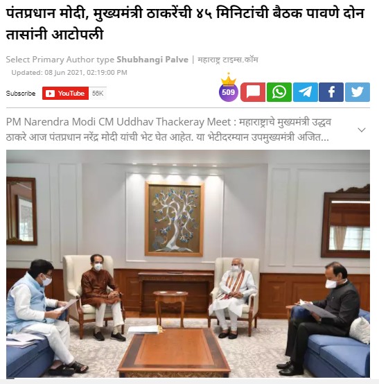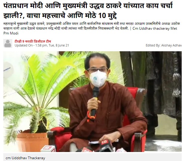 बातमीत म्हटले आहे की, पंतप्रधान मोदी, मुख्यमंत्री ठाकरेंची 45 मिनिटांची बैठक पावणे दोन तासांनी आटोपली. या बैठकीत राष्ट्रवादी काँग्रेसचे नेते आणि महाराष्ट्राचे उपमुख्यमंत्री अजित पवार तसंच काँग्रेस नेते आणि महाराष्ट्राचे सार्वजनिक बांधकाम मंत्री तसंच मराठा आरक्षण उपसमिती प्रमुख अशोक चव्हाण मुख्यमंत्र्यांसोबत होते. सकाळी 11 वाजता पंतप्रधान नरेंद्र मोदी यांच्या लोक कल्याण मार्ग स्थित निवासस्थानी या बैठकीला सुरुवात झाली. मिळालेल्या माहितीनुसार, मराठा आरक्षण, ओबीसी आरक्षण, तौक्ते चक्रीवादळाचा फटका, लसीकरण अशा अनेक मुद्यांवर पंतप्रधान आणि मुख्यमंत्री यांच्यात ही चर्चा होत आहे.