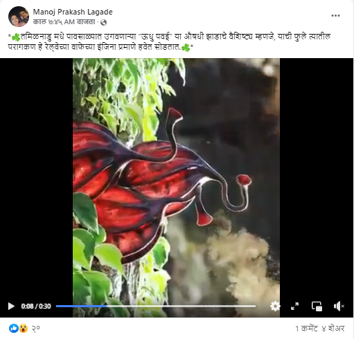 फेसबुकवर ही पोस्ट व्हायरल होत आहे. “तमिळनाडु मधे पावसाळ्यात उगवणाऱ्या ‘ऊधु पवई’ या औषधी झाडाचे वैशिष्ट्य म्हणजे, याची फुले त्यातील परागकण हे रेल्वेच्या वाफेच्या इंजिना प्रमाणे हवेत सोडतात.” असं त्या पोस्टमध्ये लिहिलं होतं.