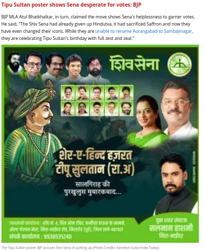 भाजपचे आमदार अतुल भातखळकर यांनी म्हटले आहे की, हे पोस्टर सेनेची मते मिळविण्यासाठी किती असहायता आहे. हे दर्शवते. ते म्हणाले, “शिवसेनेने हिंदुत्वाचा त्याग केला होता, भगव्याचा त्याग केला होता आणि आता त्यांनी त्यांचे चिन्हही बदलले आहेत. त्यांना औरंगाबादचे नाव बदलून संभाजीनगर करणे अशक्य आहे, ते टिपू सुलतानची जयंती मोठ्या उत्साहात साजरी करत आहेत.”