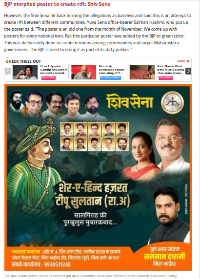 बातमीत पुढे म्हटले आहे की, शिवसेनेने या आरोपांना निराधार ठरवत पलटवार करत दोन समुदायांमध्ये तेढ निर्माण करण्याचा हा प्रयत्न असल्याचे म्हटले होते. पोस्टर लावणारे युवासेनेचे पदाधिकारी सलमान हाश्मी म्हणाले, “हे पोस्टर नोव्हेंबर 2020 मधील आहे. आम्ही प्रत्येक राष्ट्रीय सण जंयत्यांदरम्यान पोस्टर छापत असतो. पण हे विशिष्ट पोस्टर भाजपने एडिट करून हिरव्या रंगात बदलले आहे. समाजामध्ये तेढ निर्माण करण्यासाठी आणि महाराष्ट्र सरकारला लक्ष्य करण्यासाठी हे जाणूनबुजून केले गेले. भाजपला आपल्या घाणेरड्या राजकारणाचा भाग म्हणून हे करण्याची सवय आहे.” यावर त्यांनी ओरिजनल पोस्टर देखील शेअर केल्याचा बातमीत उल्लेख आहे.