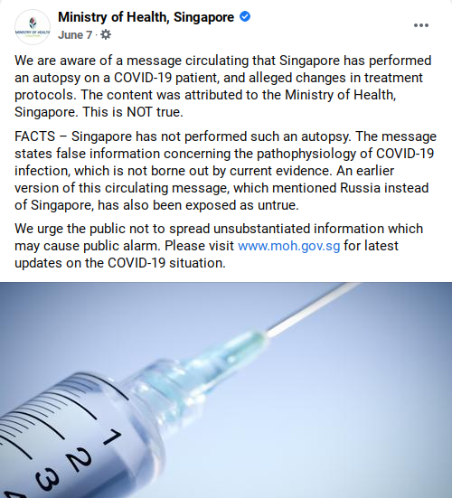 सिंगापूरने WHO च्या नियमांविरुद्ध कोरोना रुग्णाचे पोस्टमार्टम करुन जगापुढे सत्य आणल्याचा दावा सोशल मीडियात व्हायरल झाला आहे. यात म्हटले आहे की, “कोविड-19 मुळे मृत्यू झालेल्या लोकांच्या मृतदेहाचे शवविच्छेदन (पोस्टमार्टम) करणारा सिंगापूर जगातील पहिला देश बनला आहे. सखोल तपासानंतर असे आढळून आले की कोविड -19 हा विषाणू म्हणून अस्तित्वात नाही, तर किरणोत्सर्गाच्या संपर्कात आलेला जीवाणू आहे आणि रक्तामध्ये गोठून मानवी मृत्यूला कारणीभूत आहे”.