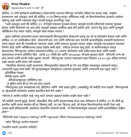 दावा क्र-4- सिंगापूरच्या आरोग्य मंत्रालयाने कोविड -19 उपचार ‘प्रोटोकॉल’ मध्ये त्वरित बदल केला आणि त्याच्या सकारात्मक रुग्णांना एस्पिरिन दिले. त्यांनी 100 मिली ग्रॅम आणि ‘Imromac’ घेण्यास सुरुवात केली. परिणामी, रुग्ण बरे होऊ लागले आणि त्यांची तब्येत सुधारू लागली.