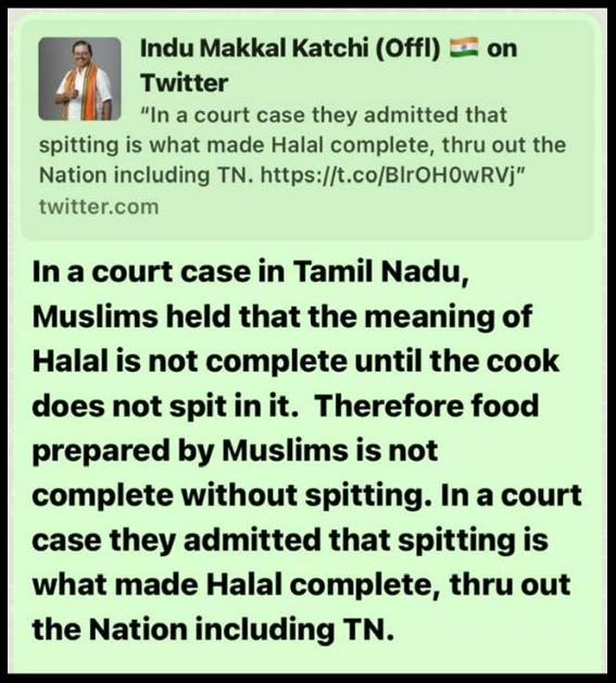 व्हाट्सअप आणि सोशल मीडिया प्लॅटफॉर्मवर एक संदेश मोठ्या प्रमाणावर शेअर केला जात आहे, ज्यात दावा केला आहे की तामिळनाडूमधील न्यायालयीन सुनावणीदरम्यान, मुस्लिम गटांनी कबूल केले की ‘हलाल’ची प्रक्रिया केवळ अन्नपदार्थांवर थुंकले तरच पूर्ण होते. मेसेजमध्ये तमिळनाडूच्या इंदू मक्कल काची यांनी नोव्हेंबर 2021 मध्ये केलेले ट्विट देखील आहे आणि त्यांनी हलाल रेस्टॉरंटमध्ये खाण्याविरुद्ध सावधानतेचा इशारा दिला आहे. न्यूजचेकरला हे दावे असत्य असल्याचे आढळले.