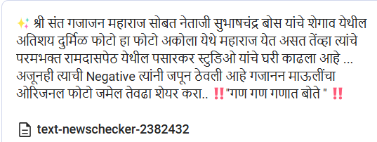 सुभाषचंद्र बोस आणि शेगावचे गजानन महाराज एका फोटोमध्ये दिसत आहेत. असा दावा एक फोटो शेयर करून केला जात आहे.