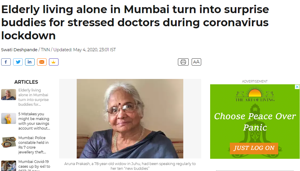न्यूजचेकरने चित्रांवर Google रिव्हर्स इमेज सर्च केले आणि टाइम्स ऑफ इंडियाने 4 मे 2020 रोजी अपलोड केलेला एक लेख सापडला. लेखानुसार, महिलेची ओळख अरुणा प्रकाश अशी आहे, त्या 78 वर्षांच्या असून ती जुहू येथे राहतात. स्वयंसेवकांपैकी एक असून त्या डॉक्टर आणि वृद्धांना मदत करण्याच्या उद्देशाने नवीन हेल्पलाइनमध्ये कोविड बाधित रुग्णांचे मनोधैर्य वाढविण्यासाठी काम करतात.