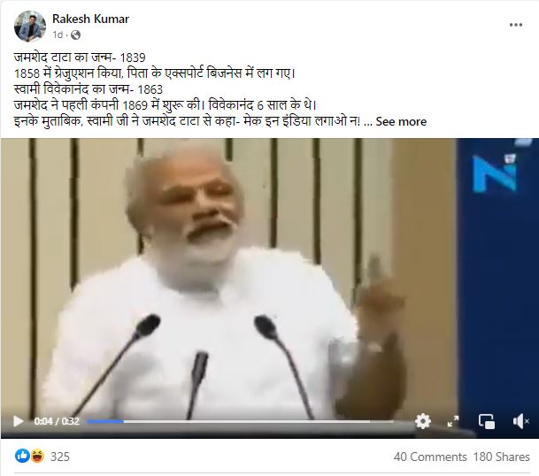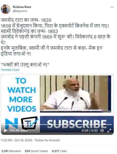 हा व्हिडीओ शेअर करून लोक प्रश्न उपस्थित करत आहेत की जमशेदजी टाटा यांनी 1869 मध्ये पहिली कंपनी सुरू केली आणि त्यावेळी विवेकानंद 6 वर्षांचे होते,एवढा लहान मुलगा जमशेदजी टाटा यांना उद्योग सुरू करण्यास कसे सांगू शकतो.