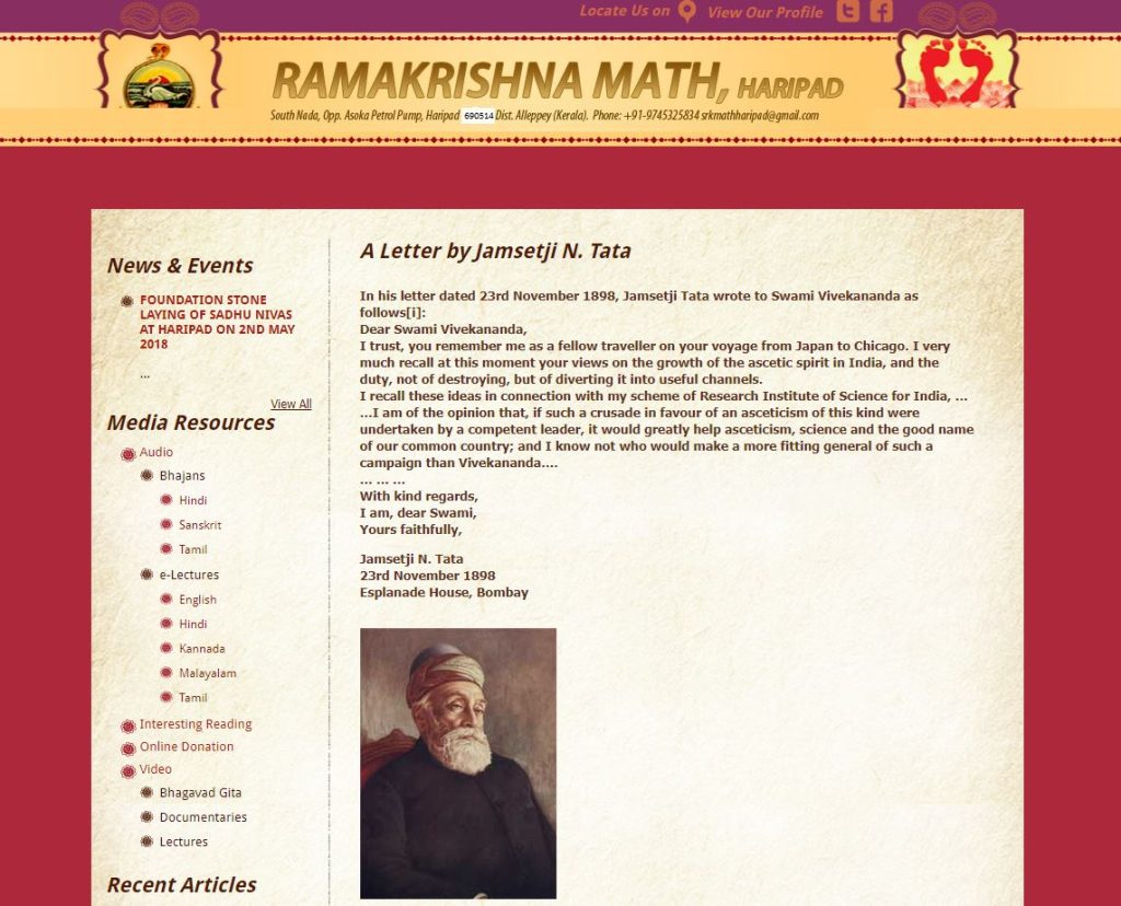 जमशेदजी टाटा यांनी स्वामी विवेकानंदांना पाठवलेले हे पत्र केरळच्या रामकृष्ण मिशनच्या वेबसाइटवरही उपलब्ध आहे.या पत्रात त्यांनी विवेकानंदांशी जहाजावरील भेटीची आठवण करून संशोधन संस्था सुरू करण्याबाबतही उल्लेख केला आहे.पत्रात त्यांनी स्वामी विवेकानंदांना या कामात मदत करण्यास सांगितले आहे.