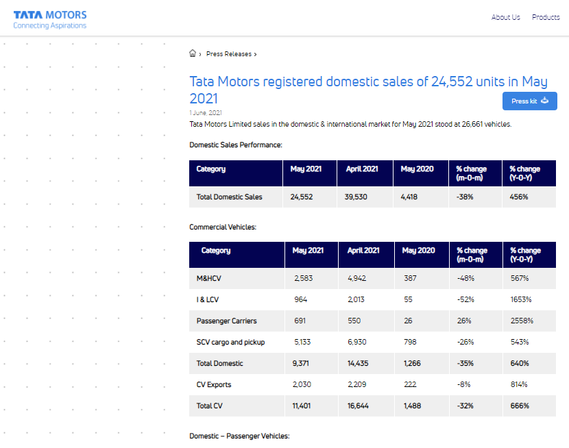 आम्हाला टाटा मोटर्सच्या अधिकृत वेबसाईटवर एक प्रसिद्धीपत्रक मिळाले. 1 जून रोजी प्रसिद्ध करण्यात आलेल्या प्रसिद्धी पत्रकानुसार टाटा मोटर्सची देशांतर्गत विक्री 24552 वाहनांची होती, तर मे 2021 मध्ये देशांतर्गत आणि आंतरराष्ट्रीय बाजारात एकूण 26,661 वाहने विकली गेली.