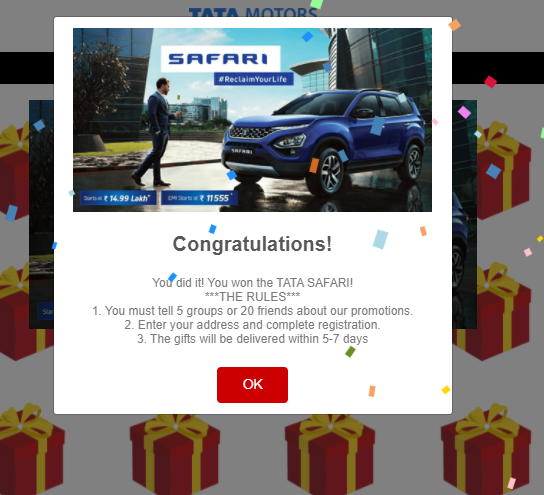 व्हायरल होत असेलली लिंक ओपन केली असता चार प्रश्न विचारले जातात आणि चारही प्रश्नांची उत्तरे दिल्यानंतर अभिनंदन आपण दिलेली उत्तरे यशस्वीरित्या जतन केली गेली आहेत. असे सांगण्यात येते. त्यानंतर आपण टाटा सफारी गाडी जिंकली आहे, तरी आपण रजिस्ट्रेशन करावे आणि आपल्या 20 मित्रांना देखील ही लिंक शेअर करा. आपले बक्षीस 5 ते 7 दिवसांत आपल्याला मिळून जाईल, असा मेसेज येतो.