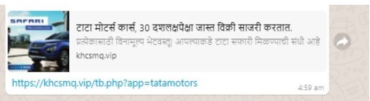 विक्रीचे लक्ष्य पूर्ण झाल्याने टाटा मोटर्स सफारी गाडी मोफत देत आहे, असा एक मेसेज सध्या सोशल मीडियात व्हायरल होत आहे. या मेसेज सोबत एक लिंक शेअर केली जात आहे. यात म्हटले आहे की टाटा मोटर्सने 30 लाख सफारी गाड्यांच्या विक्रीचे लक्ष्य पूर्ण केल्याने टाटा सफारी मोफत मिळविण्याची संधी आपणास उपलब्ध झाली आहे. लिंक ओपन केल्यावर काही प्रश्न विचारले जातील, ज्याची उत्तरे देऊन आपण टाटाची सफारी गाडी जिंकू शकता.
