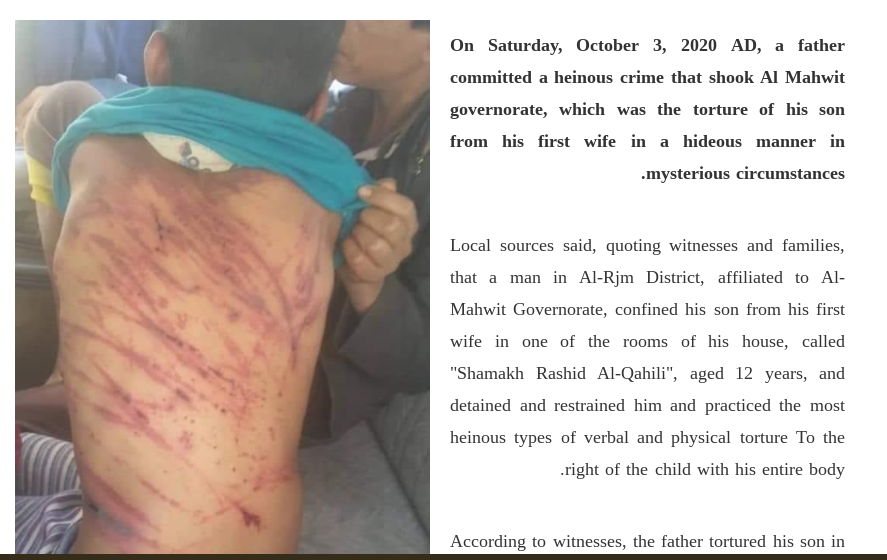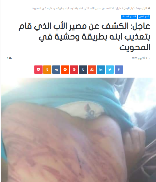 गाझियाबादमध्ये मुस्लिम मुलाला मारहाण झाल्याची बातमी खरी आहे पण व्हायरल होत असलेले फोटो त्या पीडित मुलाचेच आहेत का याचा शोध घेण्याचा आम्ही प्रयत्न केला. यासाठी गूगल रिव्हर्स इमेजच्या साहाय्याने शोध सुरु केला. अधिक शोध घेतला असता हा फोटो अरेबिक भाषेतील अनेक वेबसाईटवर हा फोटो असल्याचे आढळले. काही बातम्यांचा अनुवाद केला असता आम्हाला हा फोटो येमेन या देशातील असल्याची माहिती मिळाली. हा फोटो आॅक्टोबर 2020 मधील असल्याचे आढळून आले. येमेनमधील अल महावित शहरातील राशिद मोहम्मद अल-काहिली (वय 40) या व्यक्तीने त्याच्या स्वतःच्या चौदा वर्षीय मुलाला असे अमानुषपणे मारहाण केली होती.