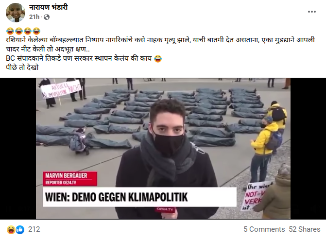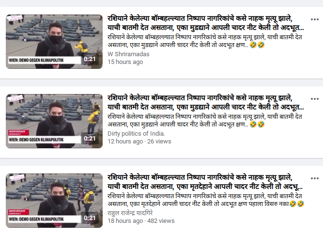 या व्हिडिओत अनेक प्रेते जमीनीवर पडलेली दिसत आहेत. याचे रिपोर्टिंग एक न्यूज रिपोर्टर करत असताना अचानक एक प्रेत आपल्या शरीरावरील कपडा व्यवस्थित करताना दिसत आहे. तितक्याच एक महिला त्याला कॅमेरा चालू आहे सांगण्यासाठी धावत त्याच्याजवळ जाते आणि ते प्रेत पुन्हा पांघरुन घेऊन निपचित पडते. यावरुन टिका करण्यात येत आहे की, टिव्ही चॅनल्स कशा प्रकारे Russia-Ukraine conflict दरम्यान पूर्वनियोजित रिपोर्टिंग करताना दिसत आहेत.
