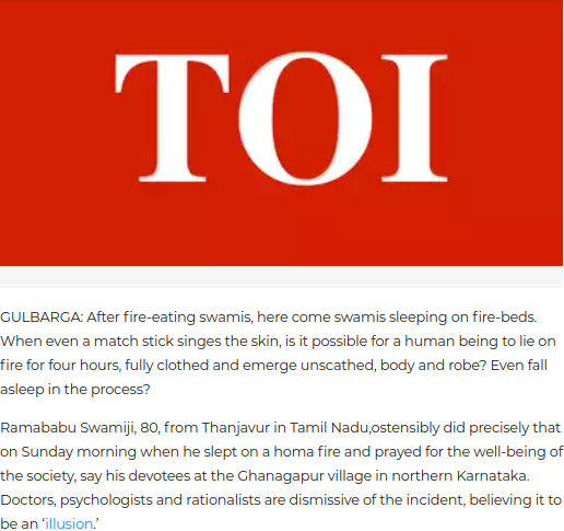 याशिवाय आम्हाला टाईम्स आॅफ इंडियाची 17 नोव्हेंबर 2009 रोजीची बातमी आढळून आली ज्यात म्हटले आहे की, तामिळनाडूतील तंजावर येथील 80 वर्षीय रामबाबू स्वामीजींनी रविवारी सकाळी होम अग्नीवर झोपून समाजाच्या कल्याणासाठी प्रार्थना केली, असे उत्तर कर्नाटकातील घनगापूर गावात त्यांचे भक्त सांगतात, मात्र डॉक्टर, मानसशास्त्रज्ञ आणि तर्कवादी या घटनेला ‘भ्रम’ मानून फेटाळून लावत आहेत.