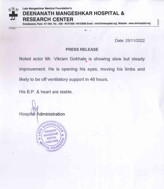 यामुळे आम्ही दीनानाथ मंगेशकर इस्पितळाशी संपर्क साधला. इस्पितळाचे व्यवस्थापक शिरीष यादगीकर यांच्याशी बातचीत केली असता, अभिनेते विक्रम गोखले यांच्या प्रकृतीत आश्वासक सुधारणा जाणवत असल्याचे त्यांनी सांगितले. त्यांच्यावरील उपचारांना ते उत्तम प्रतिसाद देत आहेत. विशेष म्हणजे त्यांनी आपले डोळे उघडले आहेत आणि त्यांचा रक्तदाब व हृदयाची क्रिया स्थिर आहे. दरम्यान अशीच सुधारणा जाणवल्यास येत्या ४८ तासात त्यांचे व्हेंटिलेटर काढले जाऊ शकते असे त्यांनी सांगितले. यासंदर्भात त्यांनी शुक्रवार दि. २५ रोजी जारी केलेले प्रसिद्धी पत्रक आम्हाला उपलब्ध करून दिले.