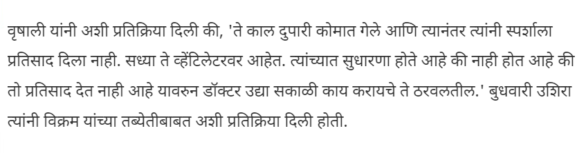 ज्येष्ठ अभिनेते विक्रम गोखले यांच्या निधनाच्या वृत्ताने खरेतर त्यांचे चाहते आणि चित्रपट सृष्टीतील माणसांना दुःख होणे साहजिक आहे. दीनानाथ मंगेशकर इस्पितळात त्यांच्यावर उपचार सुरु असताना त्यांचे निधन झाल्याच्या वृत्ताने हळहळ व्यक्त होत असताना त्यांची पत्नी आणि मुलीने निधनाच्या वृत्ताचा इन्कार केला आणि निधन झाले कि नाही हा संभ्रम निर्माण झाला. महाराष्ट्र टाइम्स ने याबद्दल गुरुवार दि. २४ नोव्हेंबर रोजी प्रसिद्ध केलेले वृत्त आपण पाहू शकता.