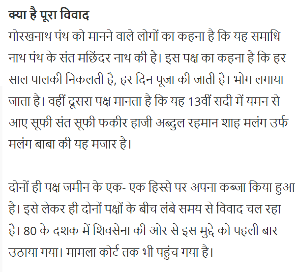 ठाणे जिल्ह्यातील मलंगगड येथे असलेल्या प्रार्थनास्थळाला दर्गा म्हणायचे की समाधी यासंदर्भातील न्यायालयीन वाद अद्याप प्रलंबित आहे. तो वाद मिटल्याची कागदपत्रे अद्याप उपलब्ध झालेली नाहीत. शिवसेना नेते किंवा हिंदू त्याला समाधी मानून १९८८ पासून आरती करीत आले आहेत. दरम्यान हा दर्गा असल्याचा मुस्लिम विश्वस्थांचा पावित्रा असून त्याबद्दल विविध मतप्रवाह आहेत. मात्र सर्व धर्मीय भाविक तेथे भक्तिभावाने जातात हा मुद्दाही महत्वाचा आहे. यामुळे तेथे करण्यात आलेल्या धार्मिक क्रियांना जातीय रंग देण्याचा प्रयत्न झाला असल्याचे आमच्या तपासात स्पष्ट झाले असून आम्ही कोणत्याही धर्मियांच्या श्रद्धेबद्दल कोणतीही टिप्पण्णी या लेखात केलेली नाही.