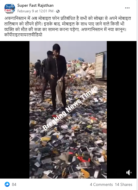 अफगाणिस्तानमध्ये मोबाईलवर बंदी घातल्याच्या दाव्याने सोशल मीडियावर एक व्हिडिओ व्हायरल होत आहे. या व्हिडिओत सैनिक मोबाईलचा ढिग पायाखाली तुडवत असल्याचे दिसत आहे. तालिबाननी मोबाईल वापरणा-यांना मृत्युदंडाची शिक्षा देणार असल्याचे या पोस्टमध्ये म्हटले आहे.