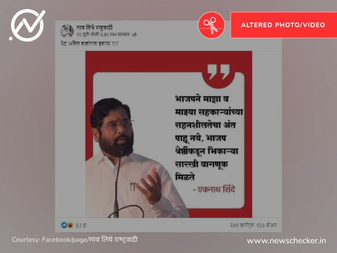 सोशल मीडियावर एका फोटोद्वारे दावा केला जातोय की, हे विधान मुख्यमंत्री एकनाथ शिंदे यांनी केले आहे. याची तथ्य पडताळणी तुम्ही इथे वाचू शकता.
