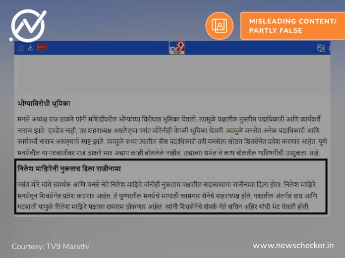 मनसेचे निलेश माझिरे २० कार्यकर्त्यांसह शिवसेनेत करणार असल्याची बातमी टीव्ही ९ मराठीने दाखवली. याची तथ्य पडताळणी तुम्ही इथे वाचू शकता.