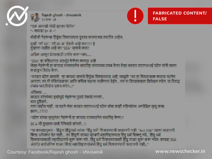 भारतीय संविधानाच्या कलम ३० अ मध्ये मोदी सरकार दुरुस्ती करण्याच्या तयारीत आहे. पण मुळात संविधानात कलम ३० अ अस्तित्वातच नाही. याची तथ्य पडताळणी तुम्ही इथे वाचू शकता.
