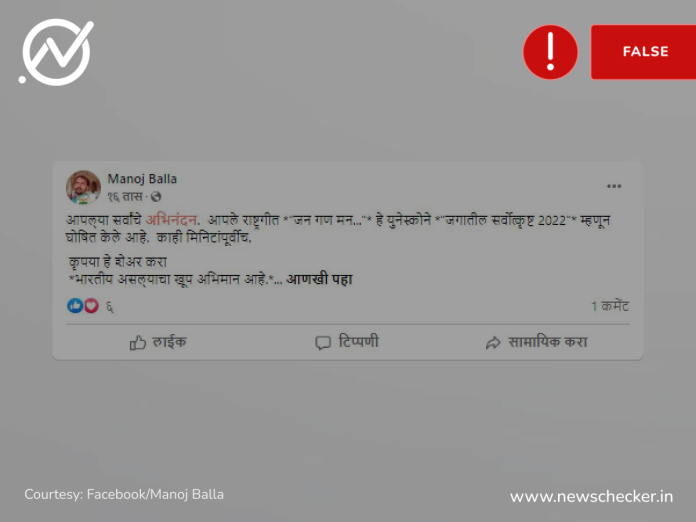 युनेस्कोने भारतीय राष्ट्रगीताला ‘जगातील सर्वोत्कृष्ट २०२२’ म्हणून घोषित केल्याचा दावा केला जात होता. याची तथ्य पडताळणी तुम्ही इथे वाचू शकता.