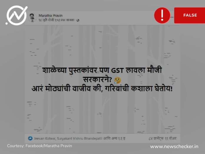 सोशल मीडियावर एक मेसेज शेअर करत दावा केलाय की, केंद्र सरकारने शाळेच्या पुस्तकांवर जीएसटी लावलाय. याची तथ्य पडताळणी तुम्ही इथे वाचू शकता.