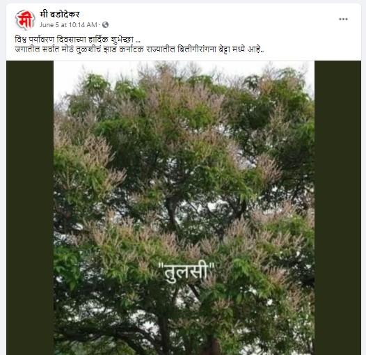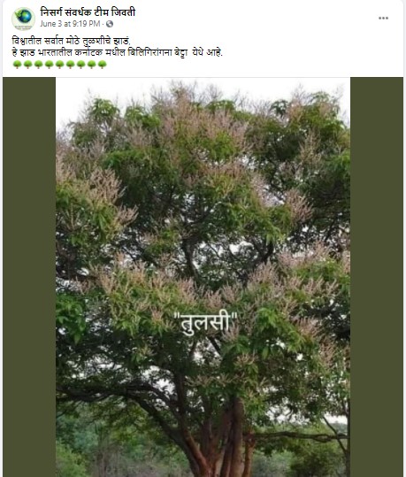 | Claim Review: जगातील सर्वात मोठे तुळशीचे झाड कर्नाटकमध्ये आहे. Claimed By: Viral Post Fact Check: False |