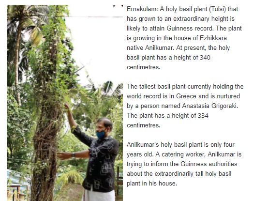 अधिक माहिती मिळविण्यासाठी आम्ही शोध पुढे सुरुच ठेवला असता आम्हाला mathrubhumi.com या वेसाईटवर 16 आॅगस्ट 2020 रोजी प्रसिद्ध झालेली बातमी आढळून आली. या बातमीनुसार विलक्षण उंचीवर वाढलेली पवित्र तुळशीची वनस्पती गिनीज रेकॉर्ड मध्ये नोंद होण्याची शक्यता आहे. एजिक्का येथील मूळ रहिवासी अनिलकुमारच्या घरात ही वनस्पती वाढत आहे स व सध्या तिची उंची 11फूट 1 इंच आहे.