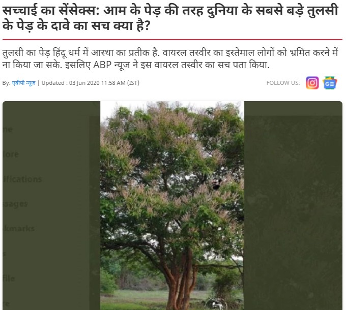 एबीपी न्यूज –https://www.abplive.com/news/india/worlds-largest-tulsi-tree-tall-as-mango-tree-fact-check-1418200