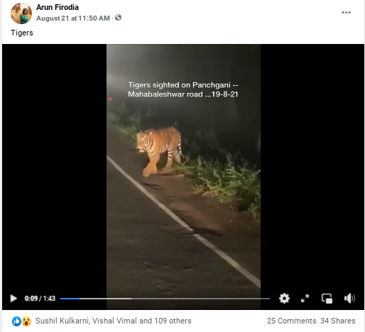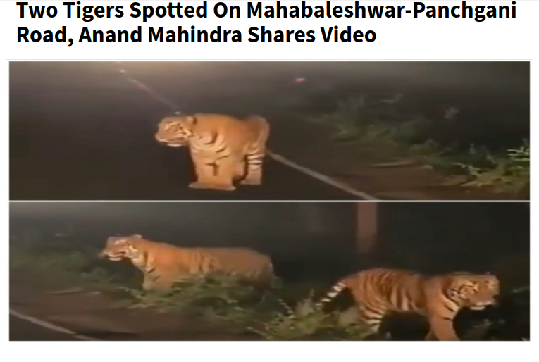 रात्रीच्या अंधारात रस्त्यावर आलेल्या दोन वाघांचा व्हिडिओ व्हायरल होत आहे. दावा करण्यात आला आहे की, हे वाघ 19 आॅगस्ट 2021 रोजीच्या रात्री महाबळेश्वर- पाचगणी रोडवर पर्यचकांच्या गाडी समोर आले होते, त्यावेळी हा व्हिडिओ शूट करण्यात आला आहे. हा व्हिडिओ प्रसिद्ध उद्योगपती आनंद महिंद्रा आणि अरुण फिरोदिया यांनी देखील याच दाव्याने शेअर केला आहे.