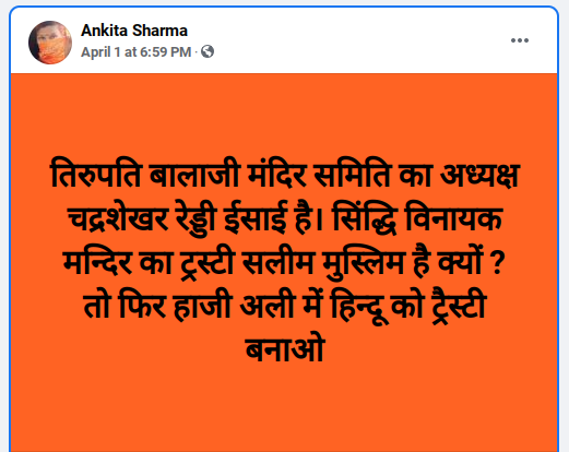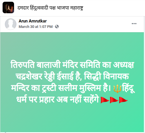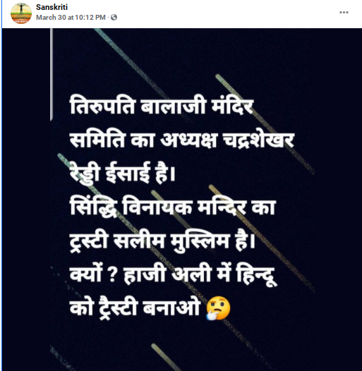 आंध्र प्रदेशचे प्रसिद्ध तिरुपती बालाजी मंदिर आणि मुंबईतील सिद्धी विनायक मंदिर ट्रस्ट संदर्भात एक पोस्ट सोशल मीडियावर व्हायरल आहे. यात म्हटले आहे की, तिरुपती बालाजी मंदिर ट्रस्टचे अध्यक्ष चंद्रशेखर रेड्डी हिंदू नसून ख्रिश्चन धर्माचे आहेत, तर सिद्धी विनायक मंदिर ट्रस्टचे एक विश्वस्त मुस्लिम असून त्यांचे नाव सलीम आहे. आता हिंदूंनाही हाजी अलीचे विश्वस्त केले पाहिजे असा दावा केला जात आहे.